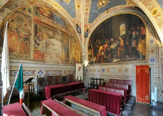 Die standesamtlichen Hochzeiten in Volterra finden im prächtigen Palazzo dei Priori statt. Dies ist das älteste Rathaus der Toskana aus dem Jahr 1257 . Der Haupteingang zu diesem Palast liegt an der „Piazza de Priori“ dem Zentrum der mittelalterlichen Stadt. Im ersten Sock führt eine große hohe Tür in den beeindruckenden Hochzeitssaal, der Sie in die Zeit der Ritter und Prinzessinnen zurückführt. Die Wände sind mit zahlreichen mittelalterlichen Malereien und Fresken geschmückt. Es ist ein besonderes Erlebnis, sich hier das Ja-Wort zu geben. – Man kann in Volterra auch im alten Römischen Theater heiraten. In Volterra selbst und in der Umgebung gibt es alte Residenzen und Bauernhäusern inmitten der Hügellandschaft. Hier kann , man auf Landgütern stilvoll feiern und atemberaubende Ausblicke genießen. Wir kennen uns in Volterra gut aus, fragen Sie uns.